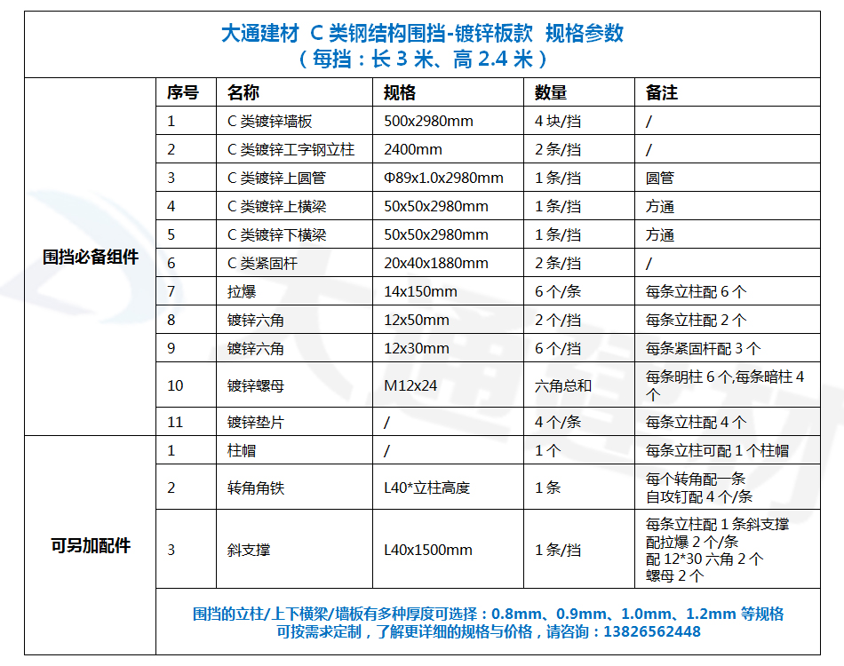 深圳大通建材C類裝配式鋼圍擋-鍍鋅板款通常作為圍墻護欄使用,起隔離防護作用。常規一擋的長度是3米、高度是2.4米和2.5米,若沒有特殊要求的項目工程按性價比來選擇鍍鋅鋼板圍擋款式建議是選擇鍍鋅鋼板圍擋c款的2.4米高的工字鋼立柱的普通款。如果對高度要求至少要2.5米高的工程,這種情況下建議使用H型鋼立柱鍍鋅鋼板圍擋c款。