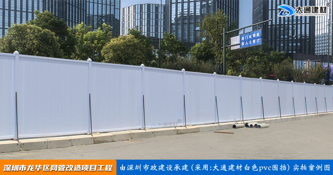 深圳市大通建材生產批發的市政標準PVC圍擋的圍擋墻板采用PVC長條版拼接,立柱、橫管均為PVC材料,內部均襯方通。立柱底板為鋼板,并加斜撐受力,來保證PVC圍擋抗風力更強、更安全穩固。大通建材常規款PVC圍擋尺寸長3mx高2.5m、長3mx高2.2m、長3mx高2m 其它PVC圍擋尺寸可按實際需要進行定制生產。